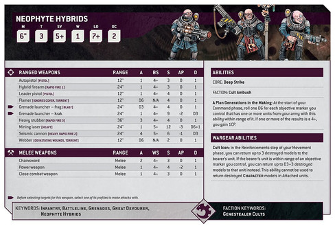 The core unit of the Genestealer Cults, the Neophyte Hybrids, can be recycled through Cult Ambush, with the aid of a Cult Icon inspiring replacements for destroyed models. Their Goliath Truck can also be utilized, taking advantage of its Firing Deck ability.